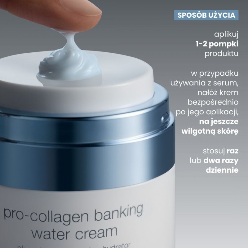 Intensywnie nawilżający krem-żel Pro-Collagen Banking Water Cream pomaga ujędrniać skórę i zachować istniejący kolagen oraz elastynę. Wspiera odporność i wytrzymałość bariery ochronnej. Zapewnia widoczną sprężystość skóry – teraz i w przyszłości. Technologia water-burst, nasycająca skórę wilgocią, aktywowana w kontakcie ze skórą, dostarcza bogatych w nawilżenie multi-peptydów i humektantów dla dogłębnego nawilżenia.